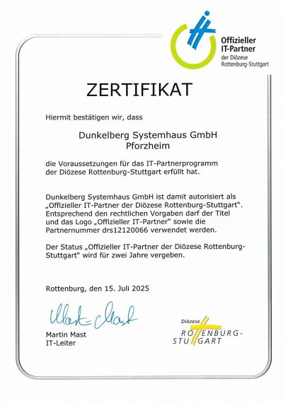 Wir freuen uns sehr, dass die Dunkelberg Systemhaus GmbH erneut als „Offizieller IT-Partner der Diözese Rottenburg-Stuttgart“ zertifiziert wurde.